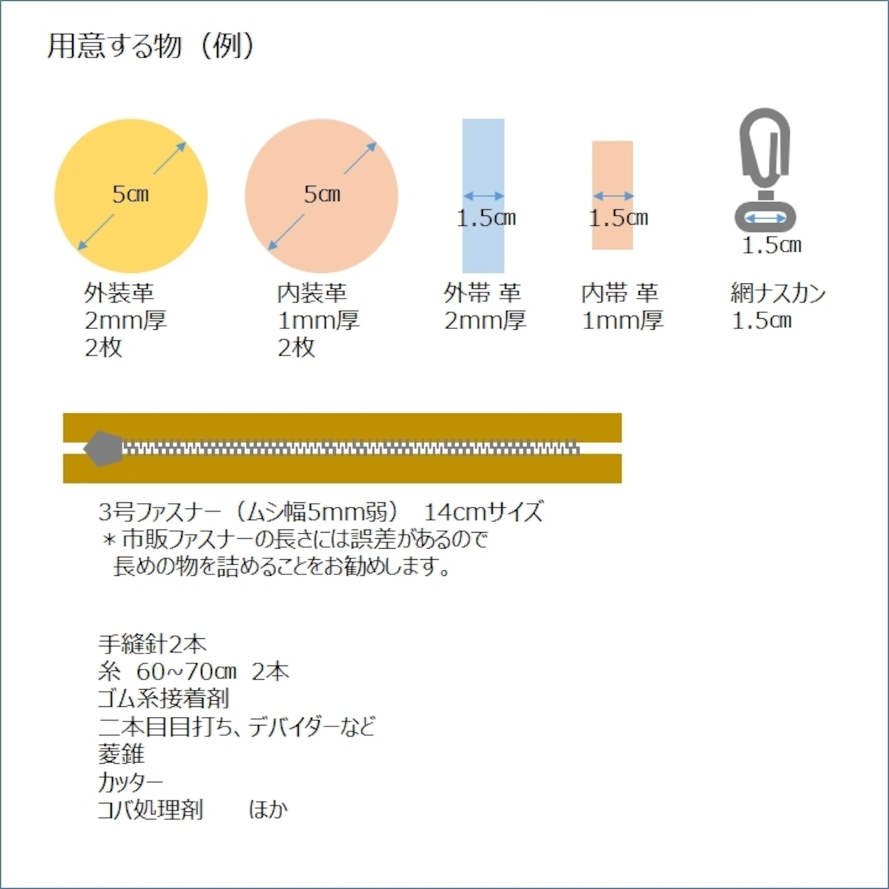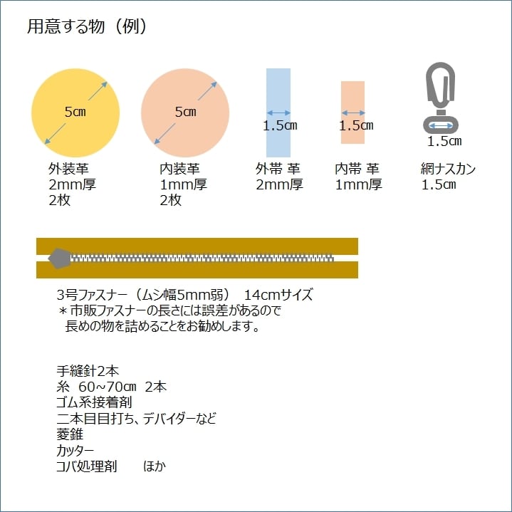 用意するものや革の大きさ、ファスナーの長さなどは商品説明の画像をご覧ください。