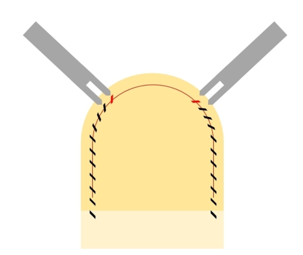 円周上の二点を、約2.7mm~5.5mmの範囲で等間隔に分割することができます。辻褄くんマルチと同じく、縫い穴を両側から攻めてきて、残りの10目程度をこれを用いて辻褄合わせすることで、自然なピッチ変化で誤魔化すことができます。