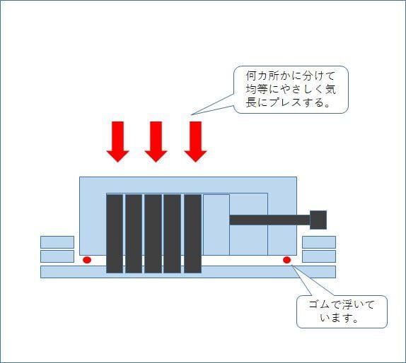 ・活字を綺麗に押すポイントは、力よりも時間です。一気に一点に集中して力をかけると活字が座屈します(治具も壊れます)。じんわりとまんべんなく、何か所にもわけて力をかけてください。